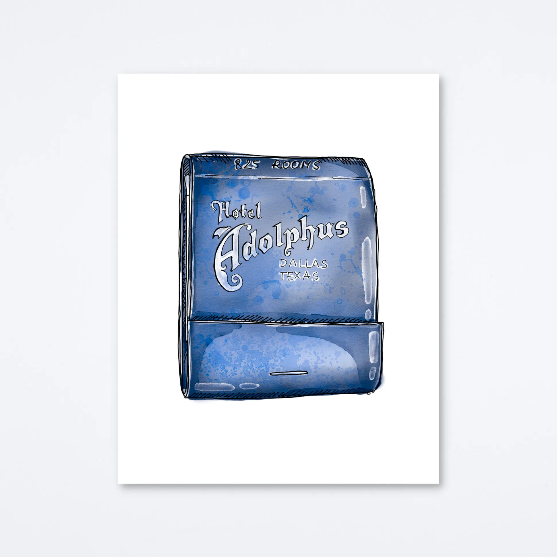 Matchbook print of original watercolor matchbook highlighting the Adolphus Hotel in Dallas Texas