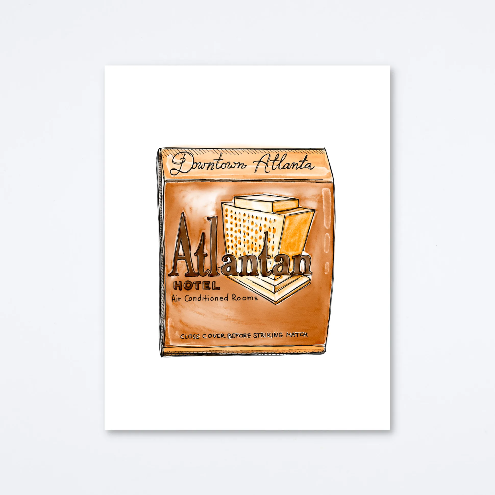 Matchbook print of original watercolor matchbook highlighting the Atlantan Hotel