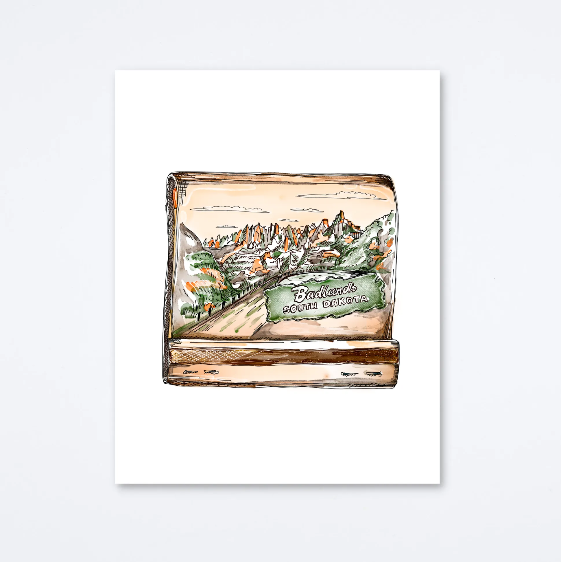Matchbook print of original watercolor matchbook highlighting the Badlands National Park in South Dakota
