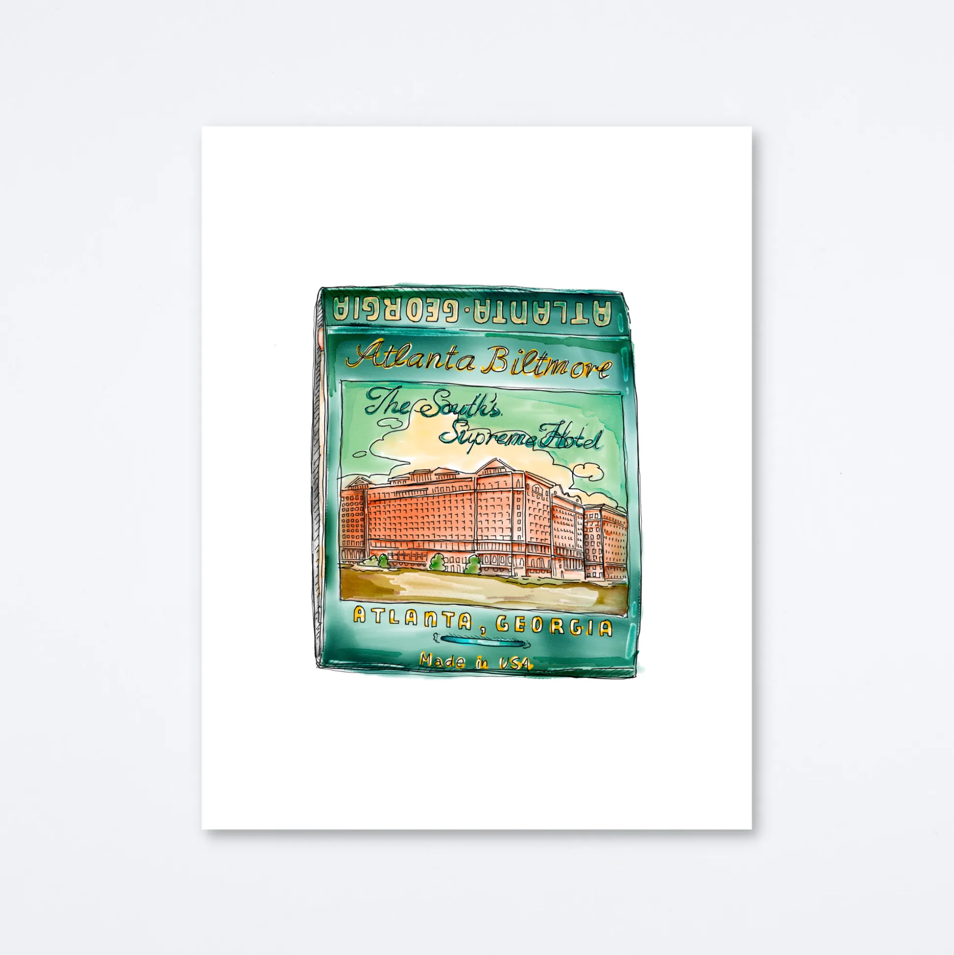 Matchbook print of original watercolor matchbook highlighting the historic Biltmore Hotel and Apartments in Atlanta, GA