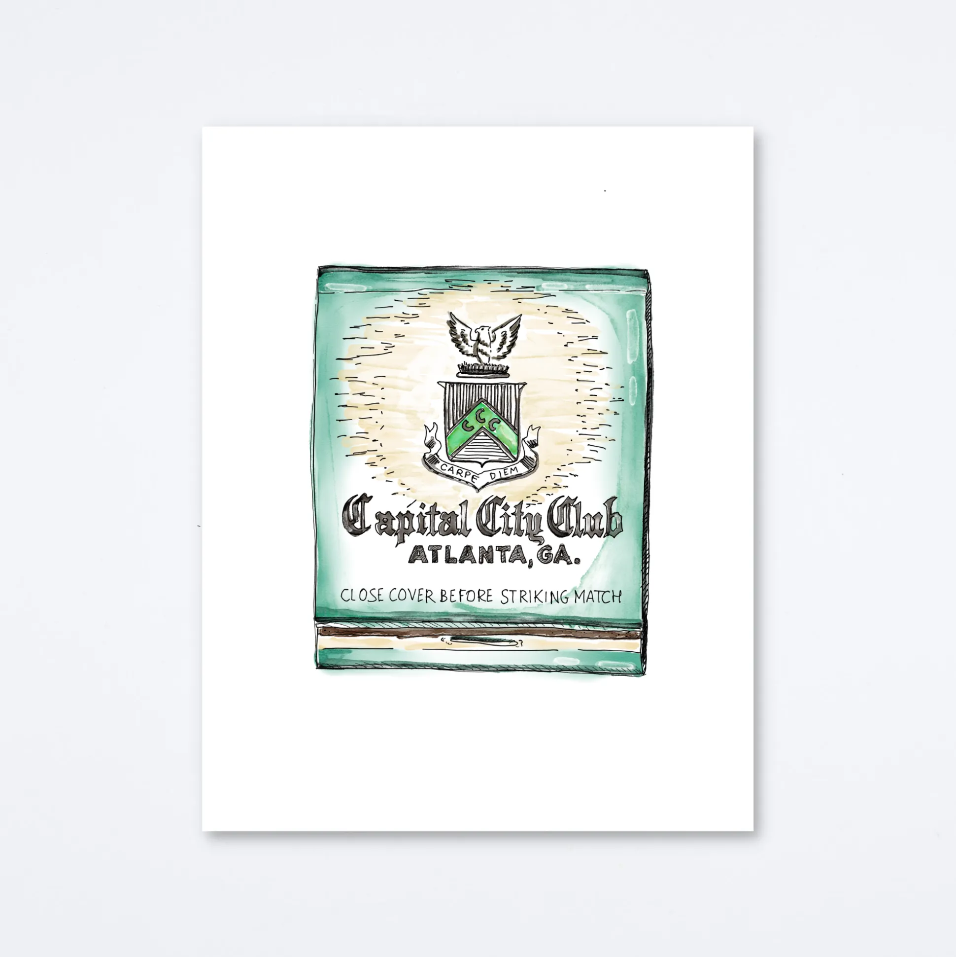 Matchbook print of original watercolor matchbook highlighting the Capital City Club in Atlanta, GA