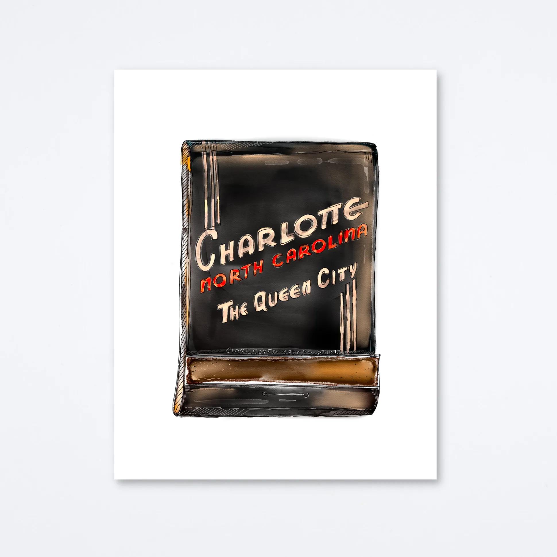 Matchbook print of original watercolor matchbook highlighting the Queen City of Charlotte, NC