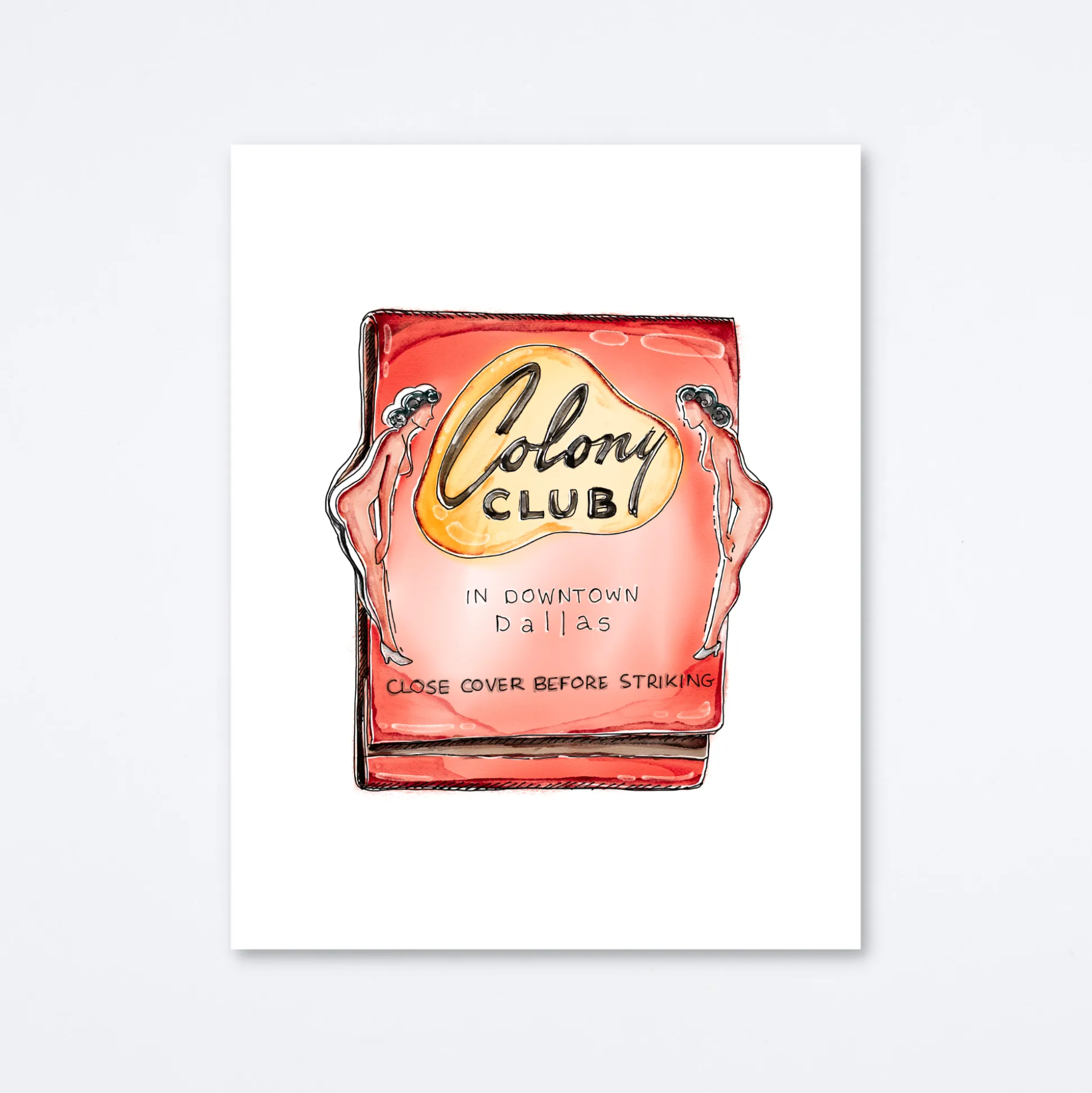Matchbook print of original watercolor matchbook highlighting the Colony Club located in Dallas, TX