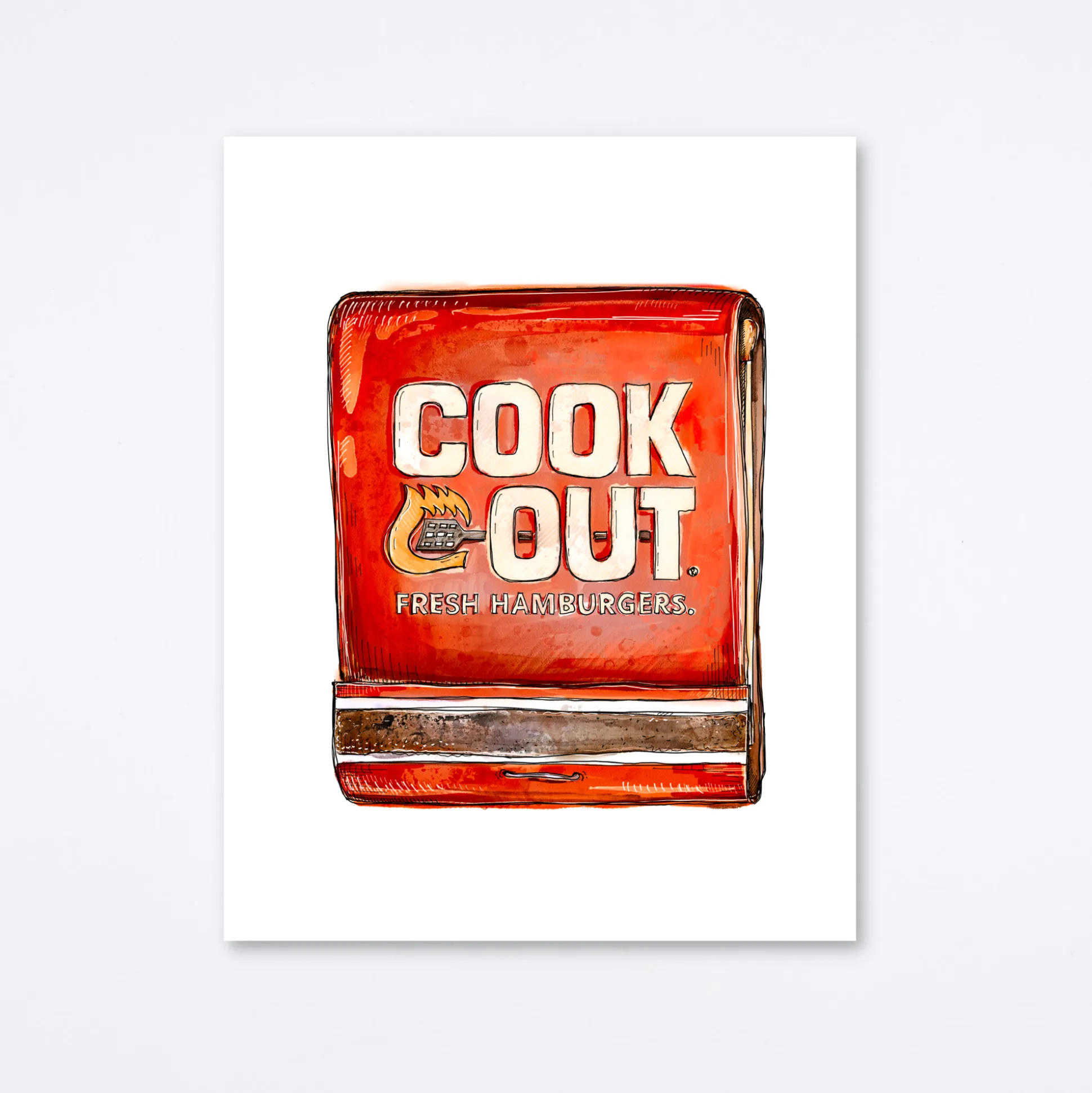 Matchbook print of original watercolor matchbook highlighting the beloved Cookout restaurant chain