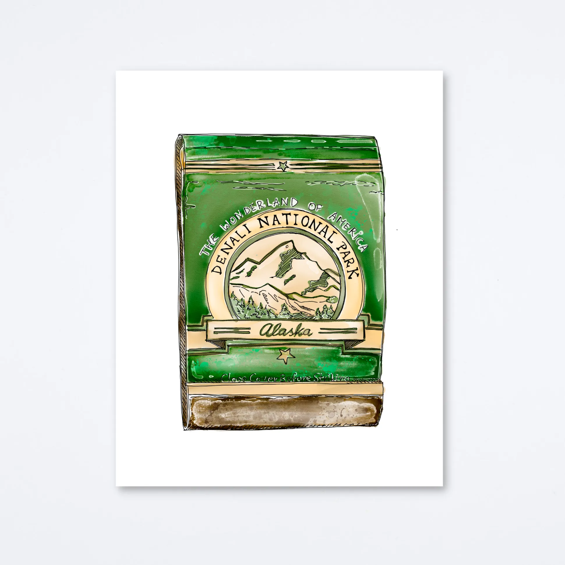 Matchbook print of original watercolor matchbook highlighting the Denali National Park in Alaska