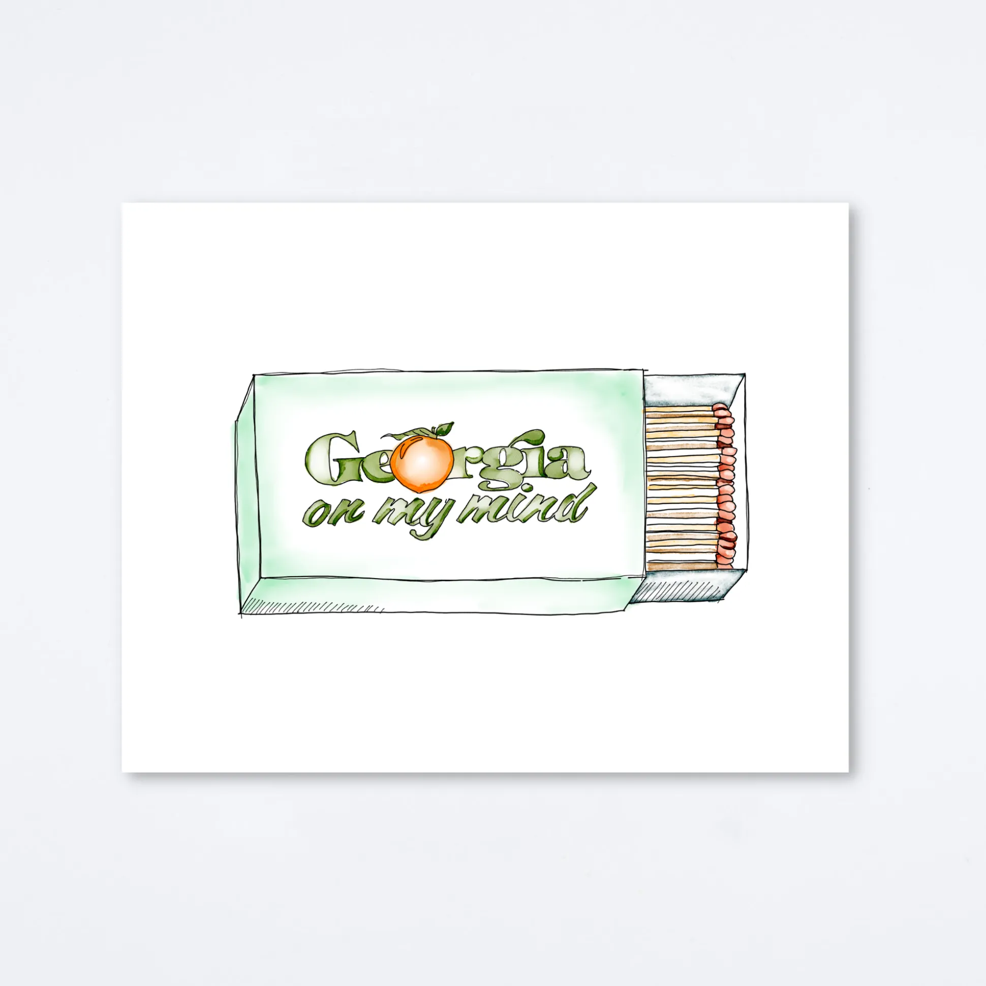 Matchbook print of original watercolor matchbook highlighting the official song of Georgia, “Georgia on My Mind” as performed by Ray Charles