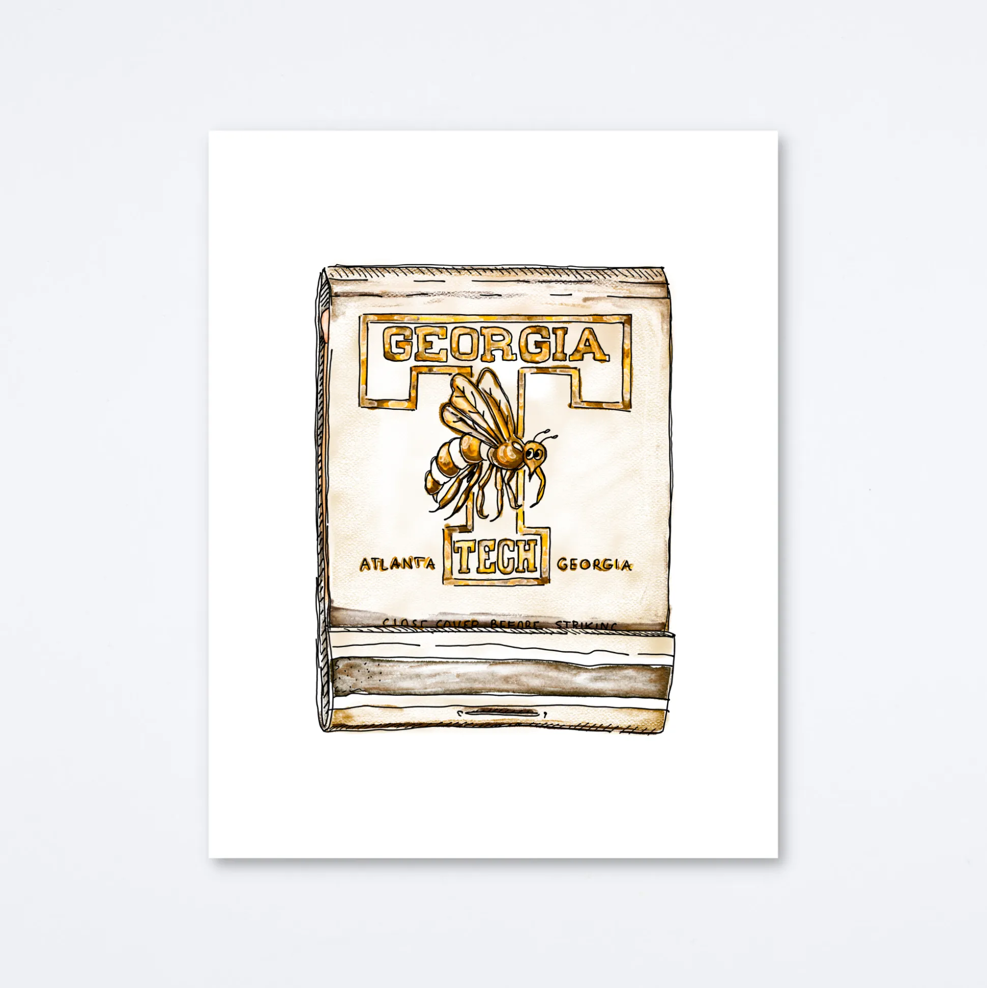 Matchbook print of original watercolor matchbook highlighting the Georgia Institute of Technology Yellow Jackets located in Atlanta, GA
