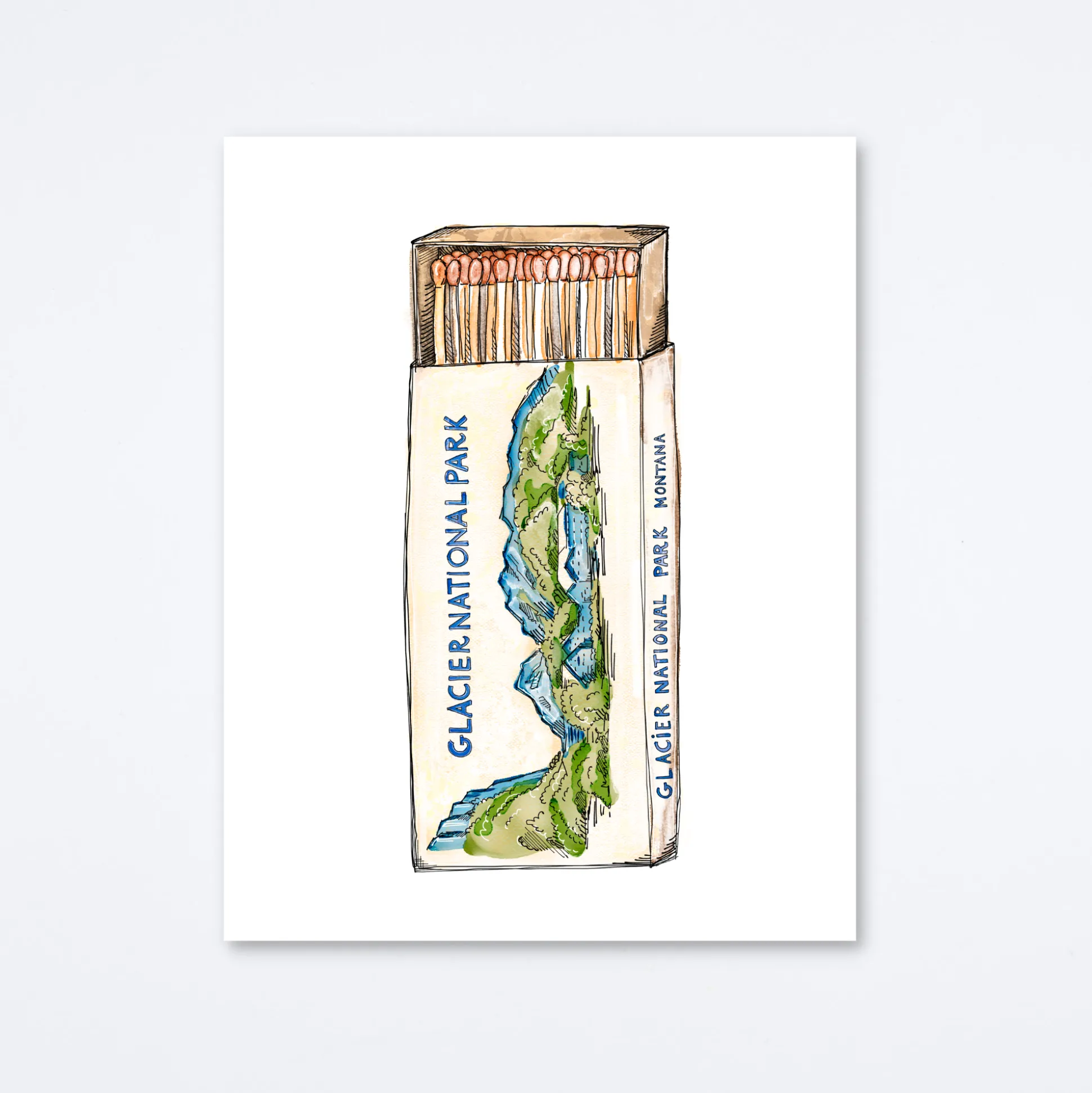 Matchbook print of original watercolor matchbook highlighting the Glacier National Park in Montana