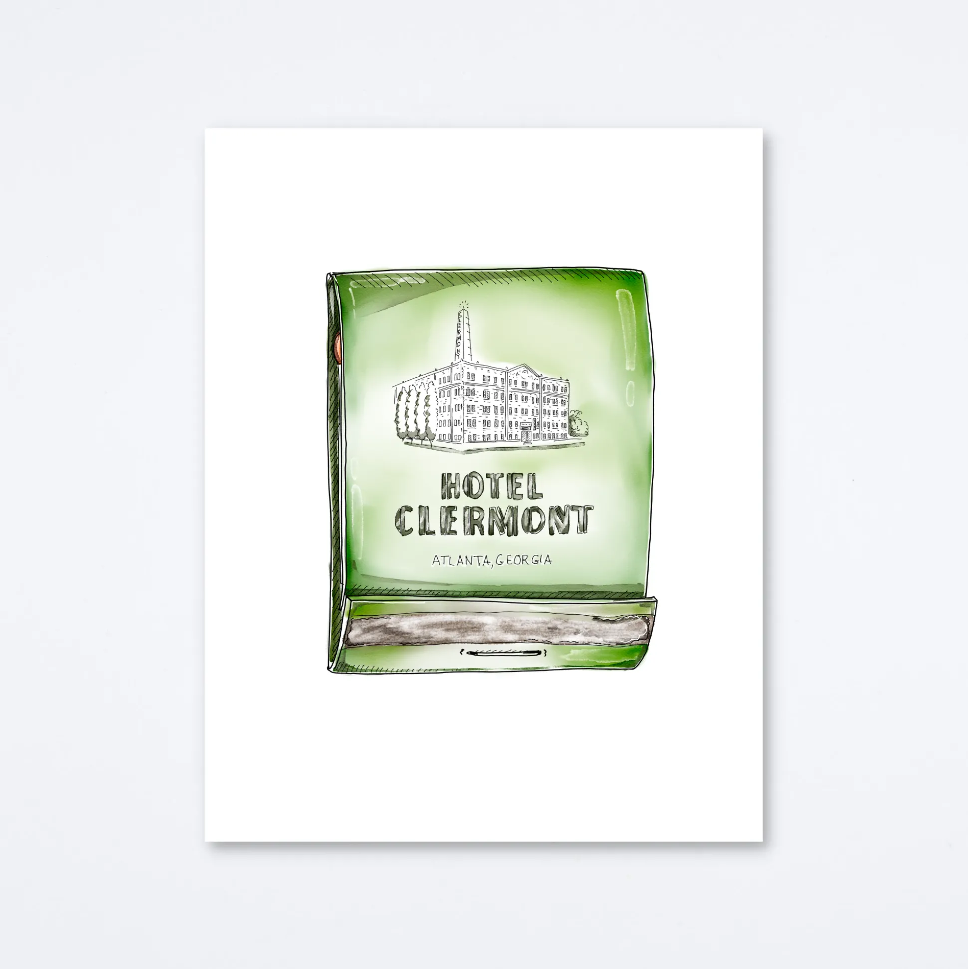 Matchbook print of original watercolor matchbook highlighting the Clermont Hotel located in Atlanta, GA