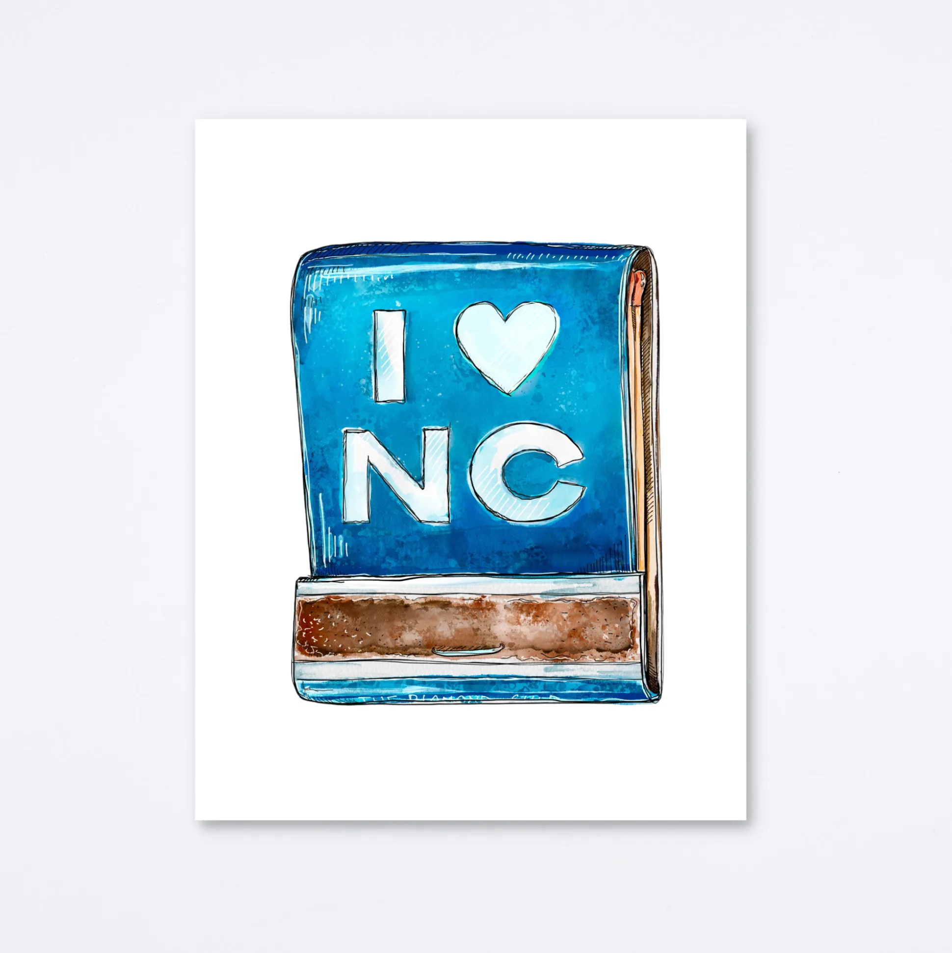 Matchbook print of original watercolor matchbook highlighting the state of North Carolina