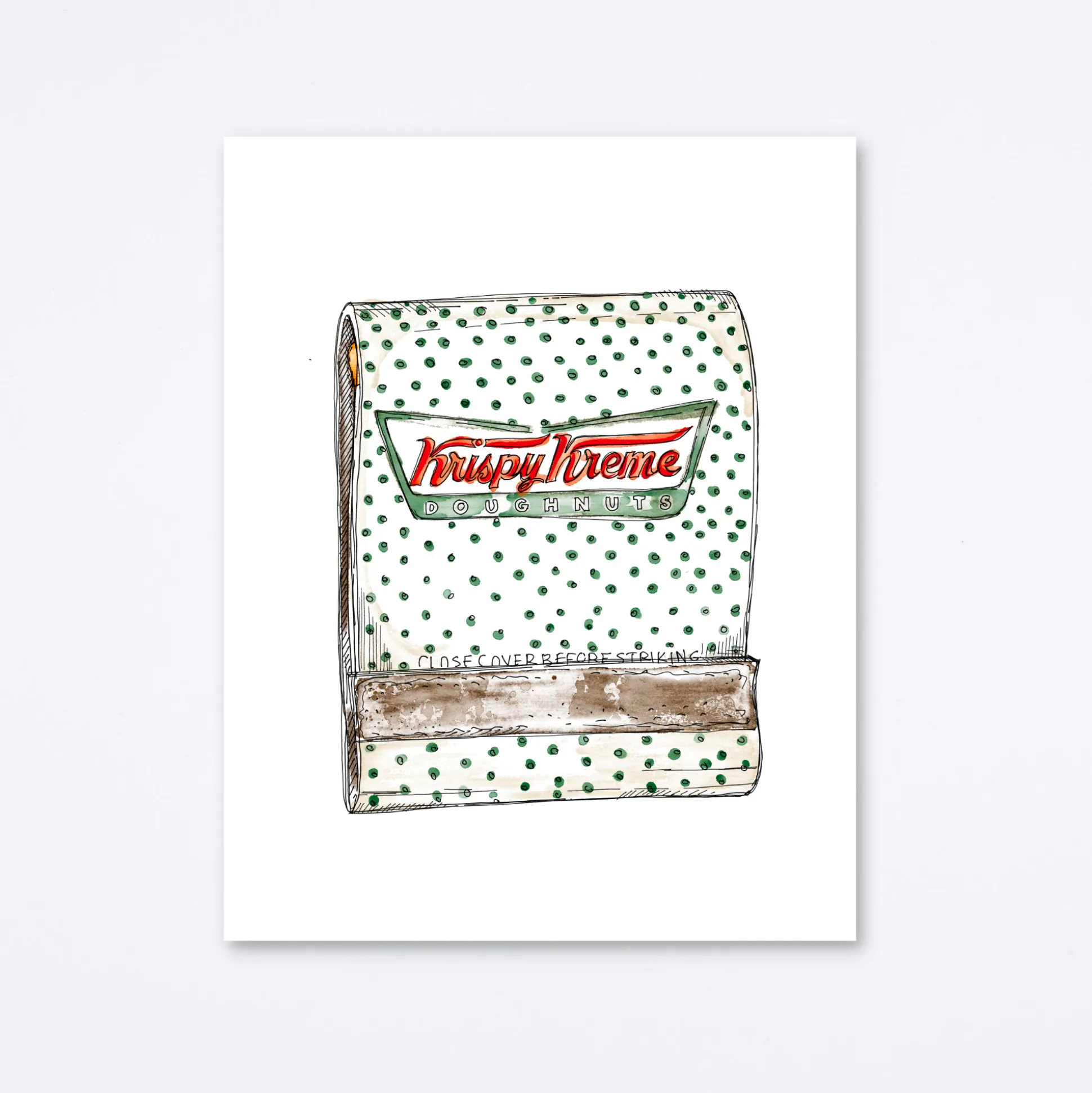 Matchbook print of original watercolor matchbook highlighting the beloved Charlotte, NC founded donut chain