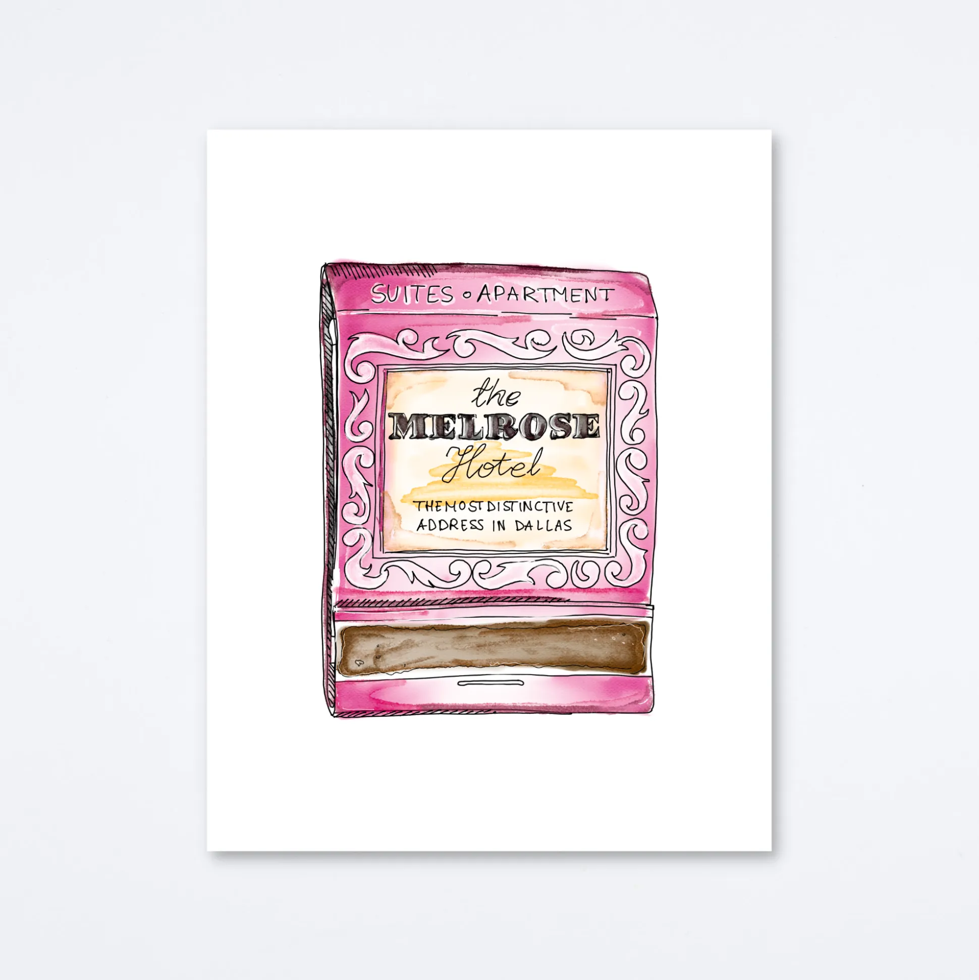 Matchbook print of original watercolor matchbook highlighting the Melrose Hotel located in Dallas, TX