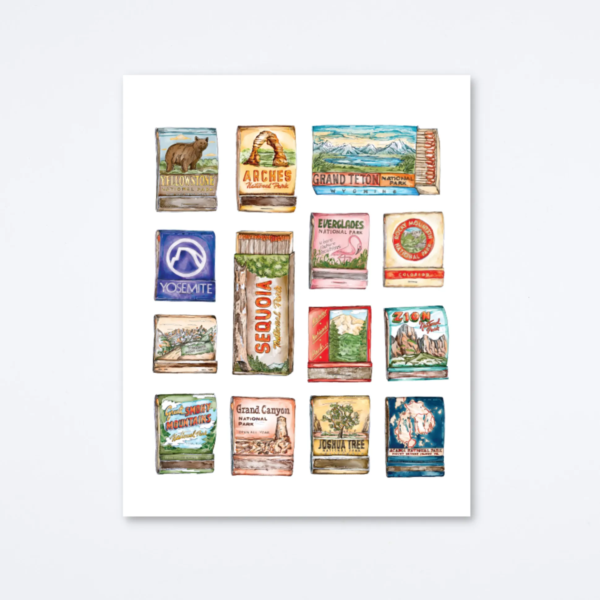 Matchbook print of original watercolor matchbook highlighting many of America’s most iconic National Parks