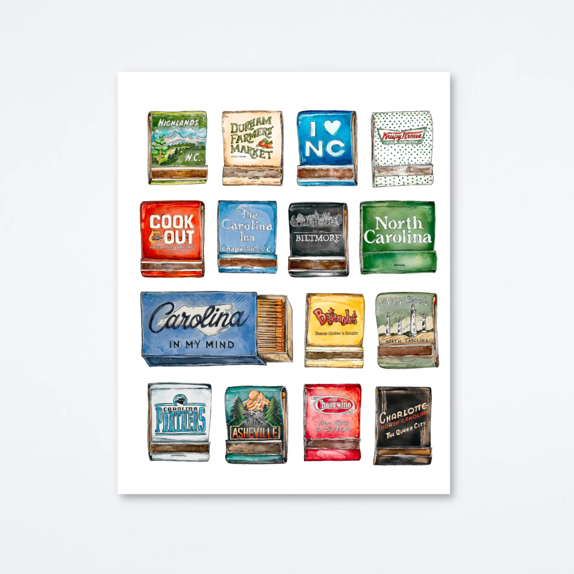 Matchbook print of original watercolor matchbook highlighting many of North Carolina’s most iconic landmarks and brands