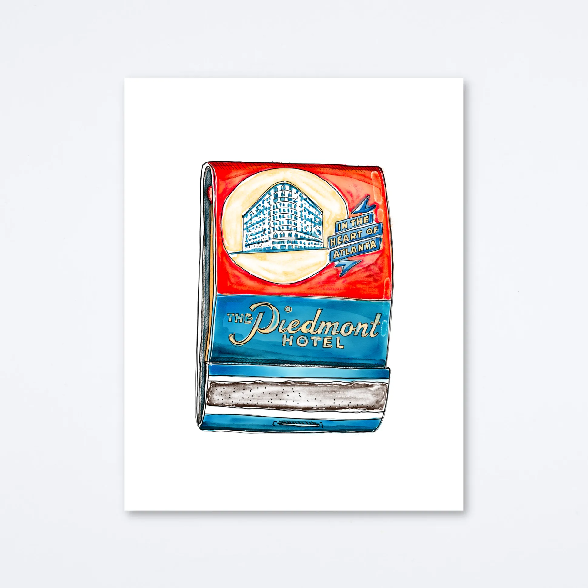 Matchbook print of original watercolor matchbook highlighting the historic Piedmont Hotel located in Atlanta, GA