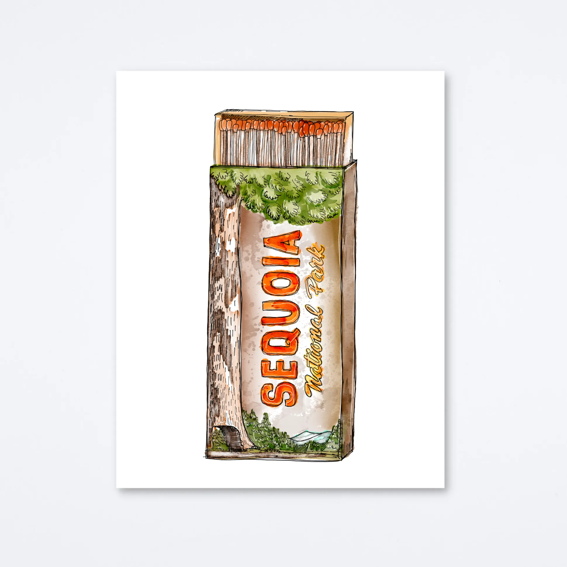 Matchbook print of original watercolor matchbook highlighting the Sequoia National Park in California