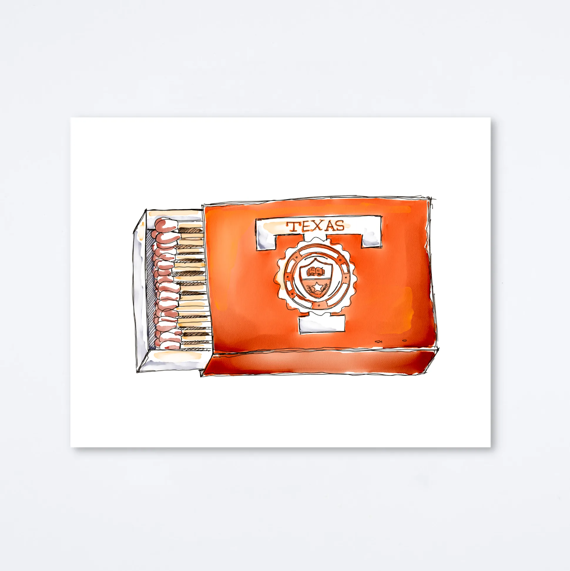 Matchbook print of original watercolor matchbook highlighting the University of Texas Longhorns located in Austin, TX
