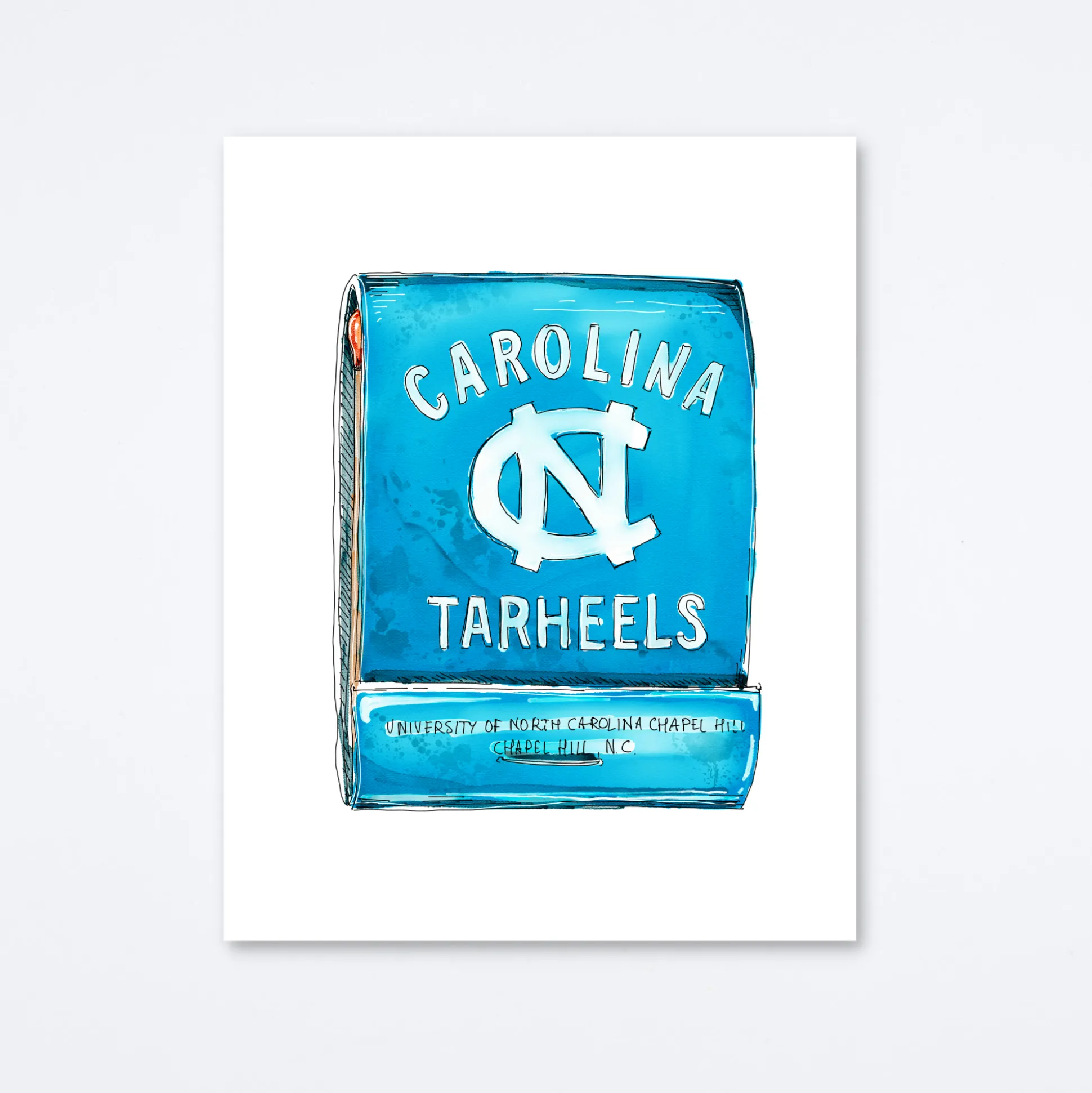 Matchbook print of original watercolor matchbook highlighting the historic University of North Carolina Tar Heels